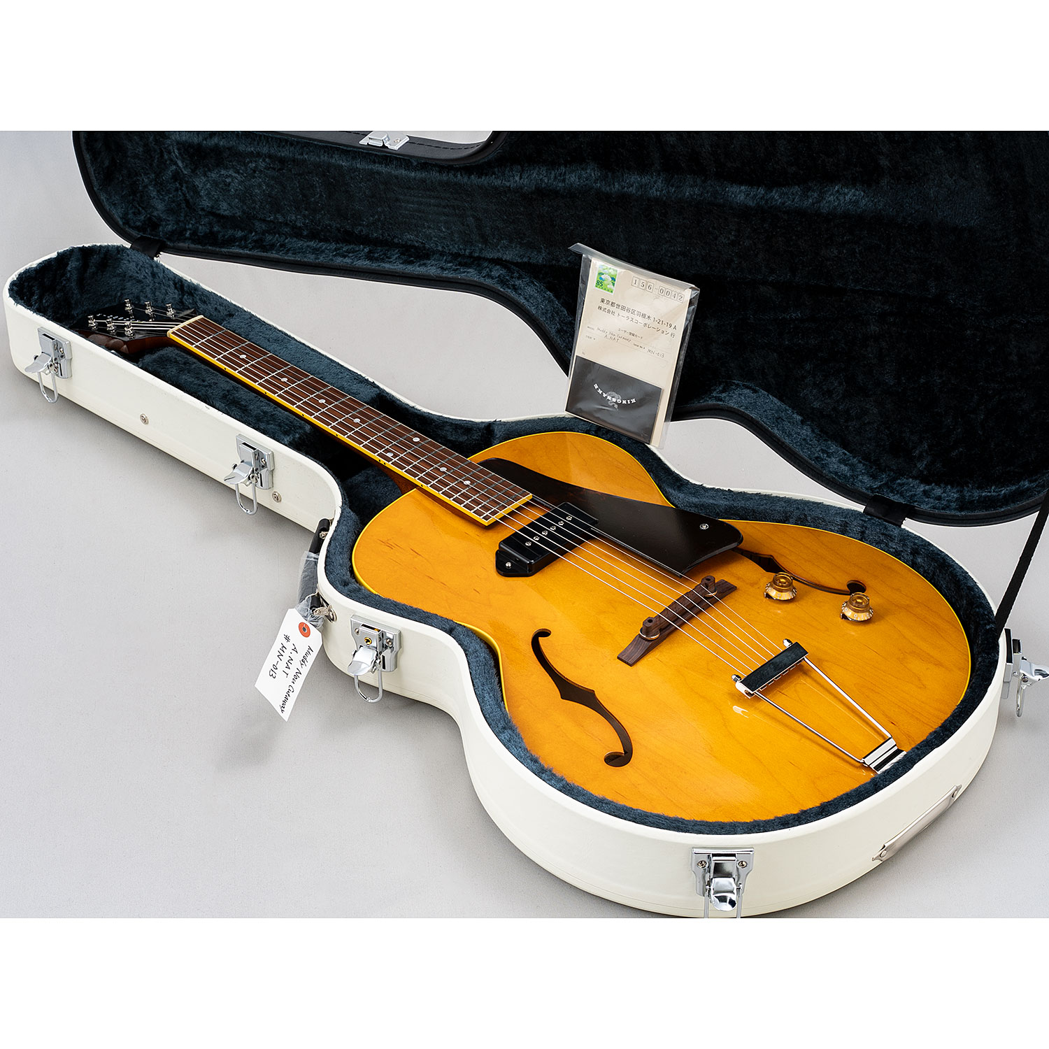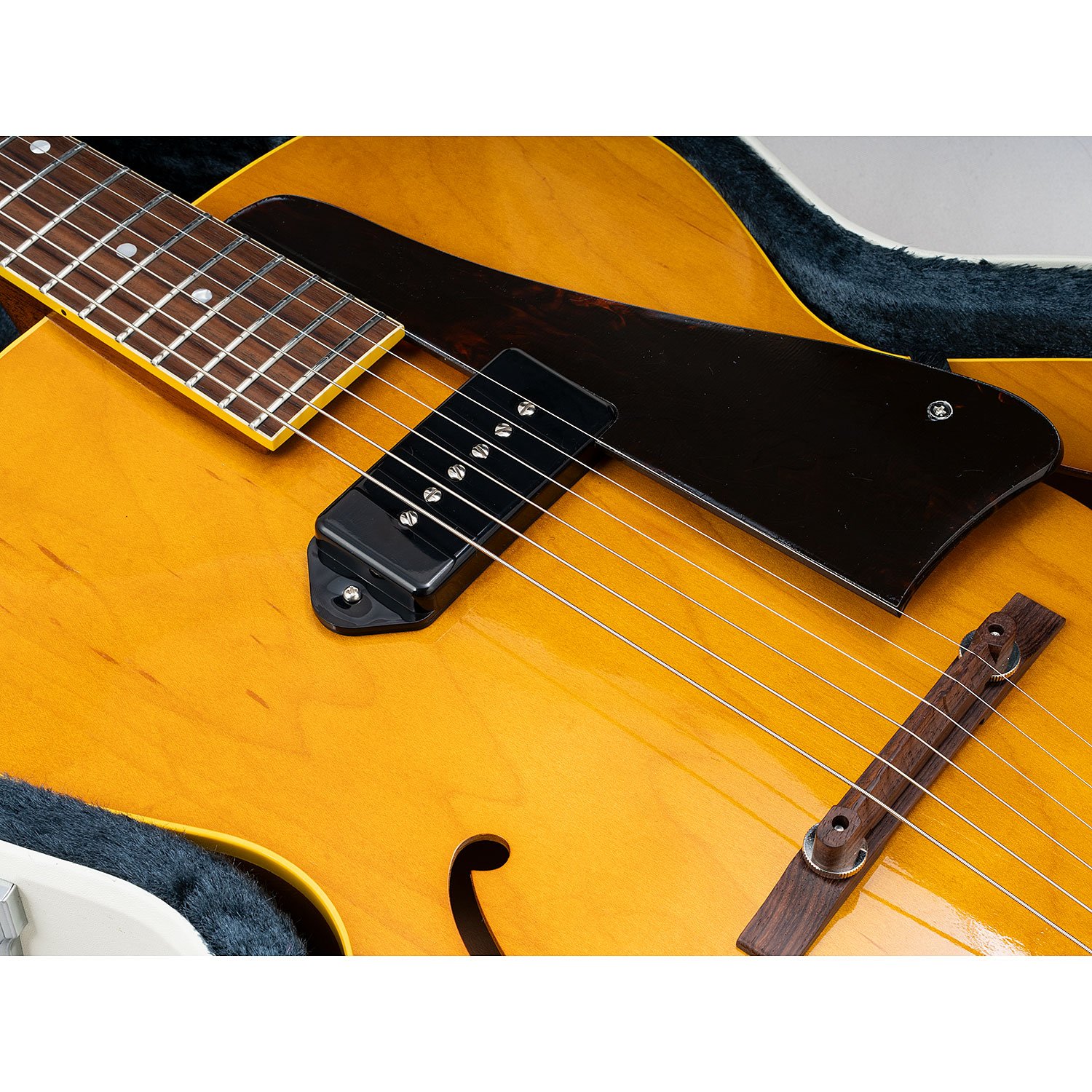 ■センターブロックの無いフルアコ仕様のシンライン・ボディに、トラピーズ・テールピース、P-90 type PU、そしてラッカー吹きっぱなしのザラッとした塗装面が非常に雰囲気があります。PUはフロントのみ。